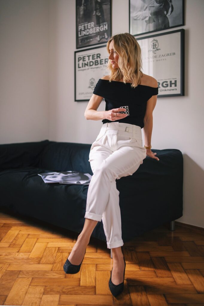 Kao i ponedjeljak, i utorak je dan obilježen poslovnim obavezama, sastancima i pripremama projekata. Marina odjevna kombinacija savršen je odabir za proljetni dan ispunjen obavezama, a ona je odlučila provesti ga u elegantnim bijelim hlačama visokog struka i crnom topu.