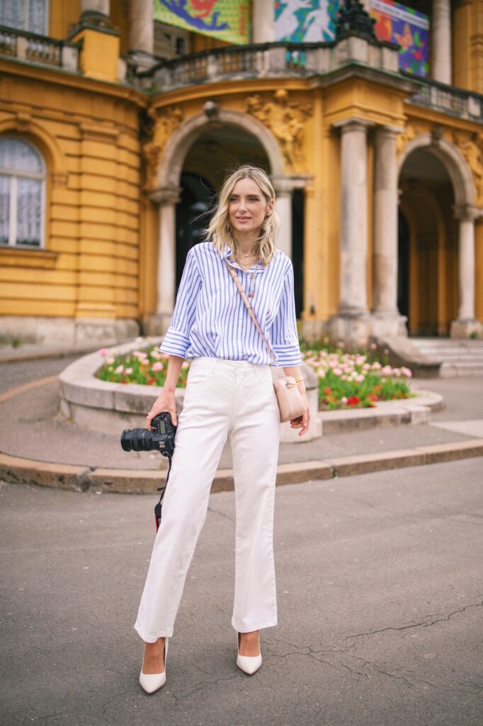 Petak je dan za kazališnu premijeru. No, Mara na nju ne dolazi kao gledateljica, već kao službena fotografkinja zagrebačkog HNK. Kako bi odjevnom kombinacijom ispoštovala dress code institucije, a istovremeno se osjećala dovoljno ugodno da nesmetano obavlja svoj posao, Mara bira trendi bijele hlače visokog struka i uparuje ih s klasičnom košuljom s uzorkom plavo-bijelih pruga. Look je zaokružila torbicom u puderastoj nijansi.