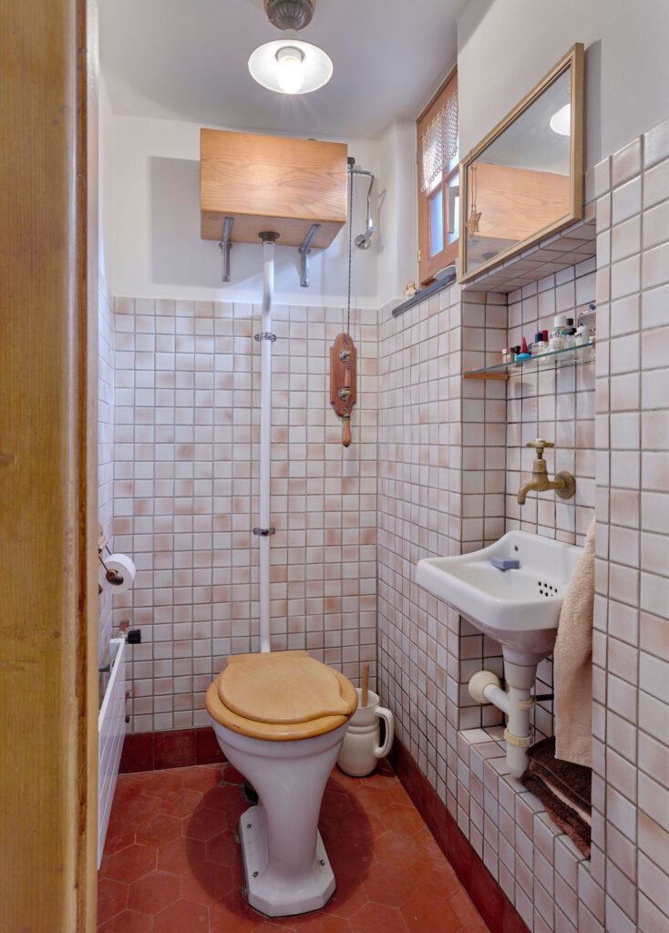 Šarm prošlog vremena: gostinjska kupaonica od 2 m2 s originalnim Phoenix drvenim vodokotlićem iz Geberita. Phoenix model vodokotlića razvijen je 1905. godine.