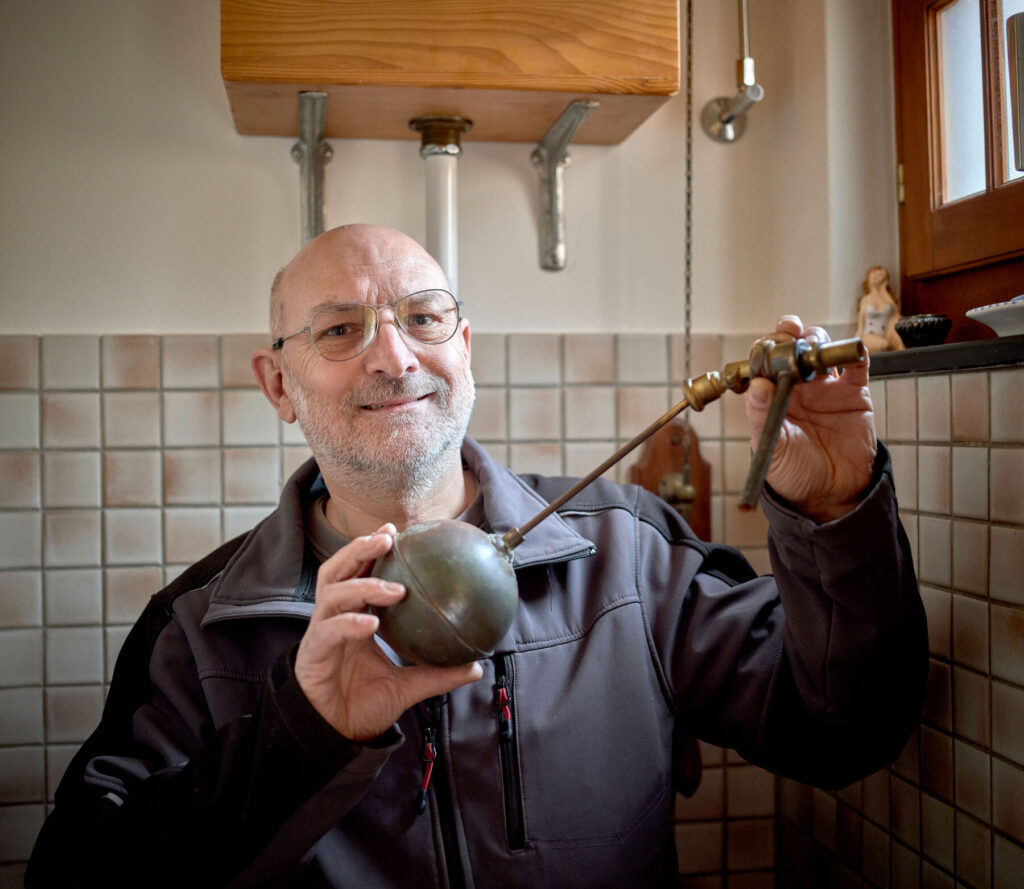 S obzirom na starost vodokotlića, servis zahtijeva odgovarajuću stručnost. Iskusni majstor, koji je svoj zanat za vodoinstalatera završio u Winterthuru prije više od 40 godina, temeljito je dekalcificirao i očistio unutrašnjost vodokotlića. „Za popravljanje ovakvog vodokotlića potrebno je znanje i vještina“, kaže, jer mehanizam radi drugačije od današnjih sustava za ispiranje.