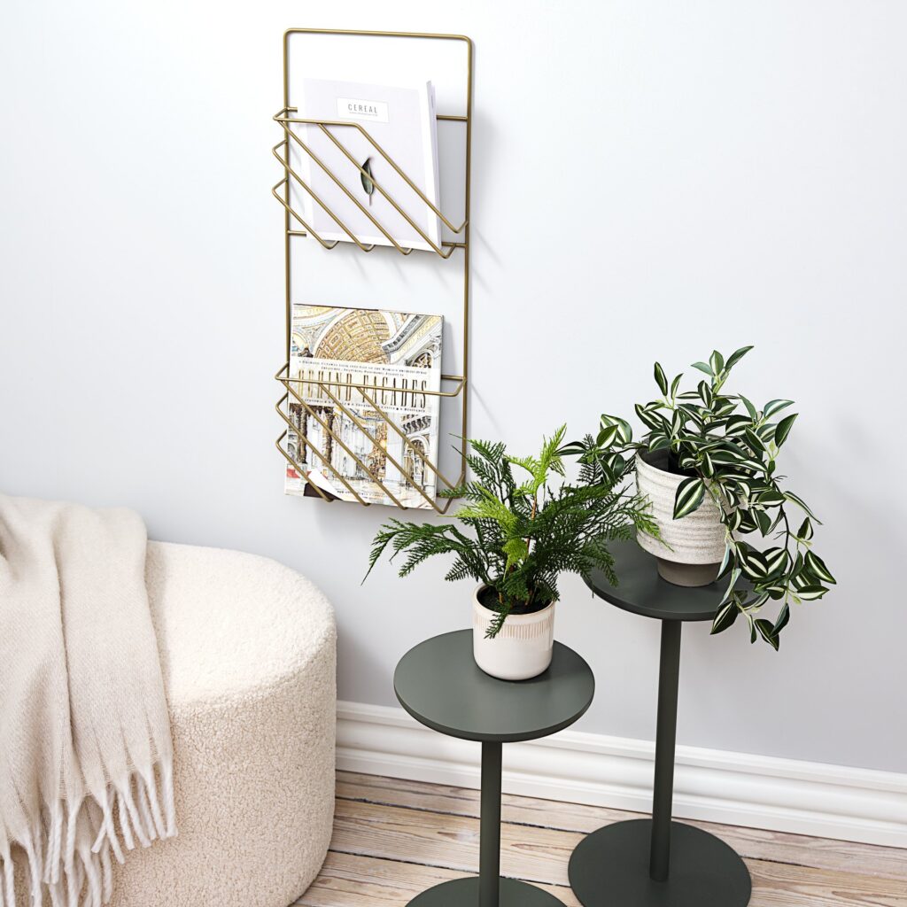 Jedan od načina da pružite novi život onome što već posjedujete je da izložite svoje knjige ili časopise na novoj zidnoj polici. Dobra ideja je zlatni stalak MAGSTRUP. Objesite ga u dnevnom boravku i popunite magazinima ili u kuhinji s nekoliko svojih omiljenih kuharica a uz njega će se savršeno uklopiti i nova kolica JUKKERUP za začine, biljke ili omiljeno piće.