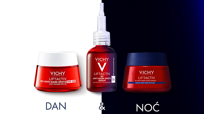 Nova krema iz laboratorija Vichy, Liftactiv B3 Anti-Dark Spots noćna krema protiv hiperpigmentacijskih mrlja sa čistim retinolom za ujednačeniji ton i blistavu kožu bori se protiv hiperpigmentacijskih mrlja uzrokovanih svakodnevnim izlaganjem UV zrakama i to snažnom kombinacijom 4 % niacinamida (vitamina B3) i 0,15 % čistog retinola. Koža je obnovljena, a ten ujednačeniji.