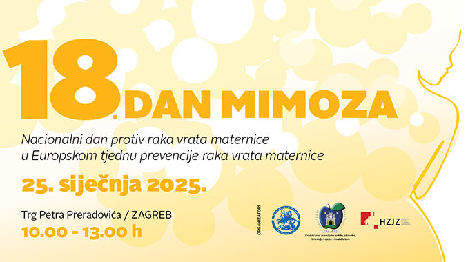 Pridružite se javnozdravstvenoj edukativnoj akciji prevencije raka vrata maternice kada će se obilježiti 18. Dan mimoza u organizaciji Hrvatske lige protiv raka, u subotu, 25. siječnja 2025., od 10.00 do 13.00 sati na Trgu Petra Preradovića u Zagrebu, kao i u brojnim drugim gradovima u Hrvatskoj.
